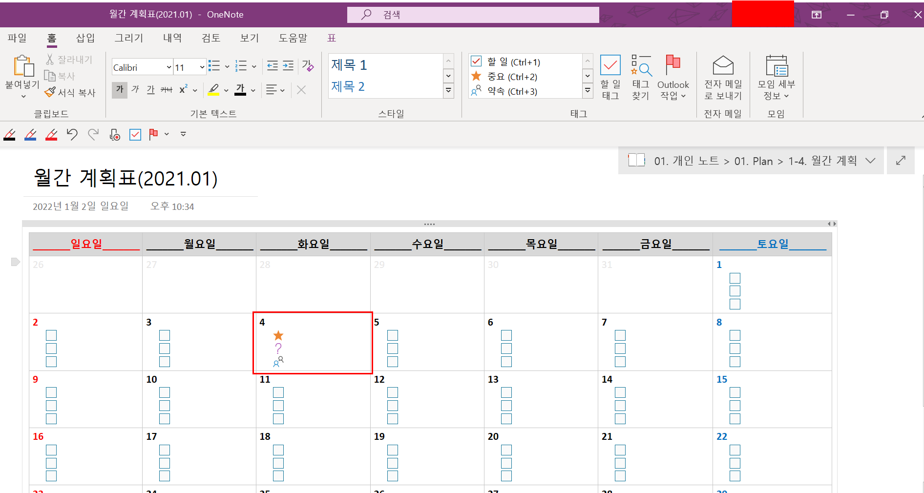 물론 구글은 답을 알고 있더라. 구글에 "원노트 달력"으로 검색하면 깔끔한 템플릿의 월간 달력을 확인할 수 있다.