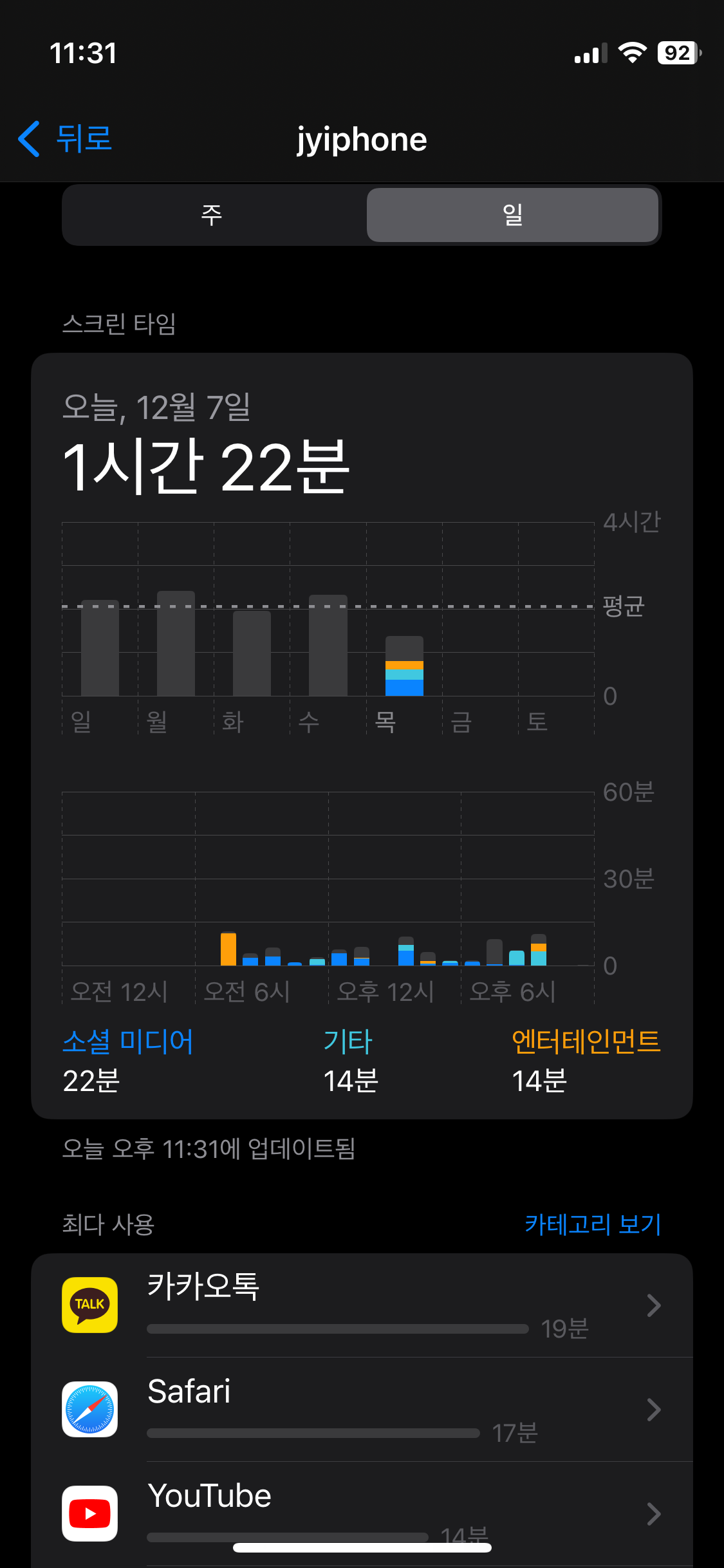 다만, 사파리와 유튜브 사용 시간이 꽤 깁니다.