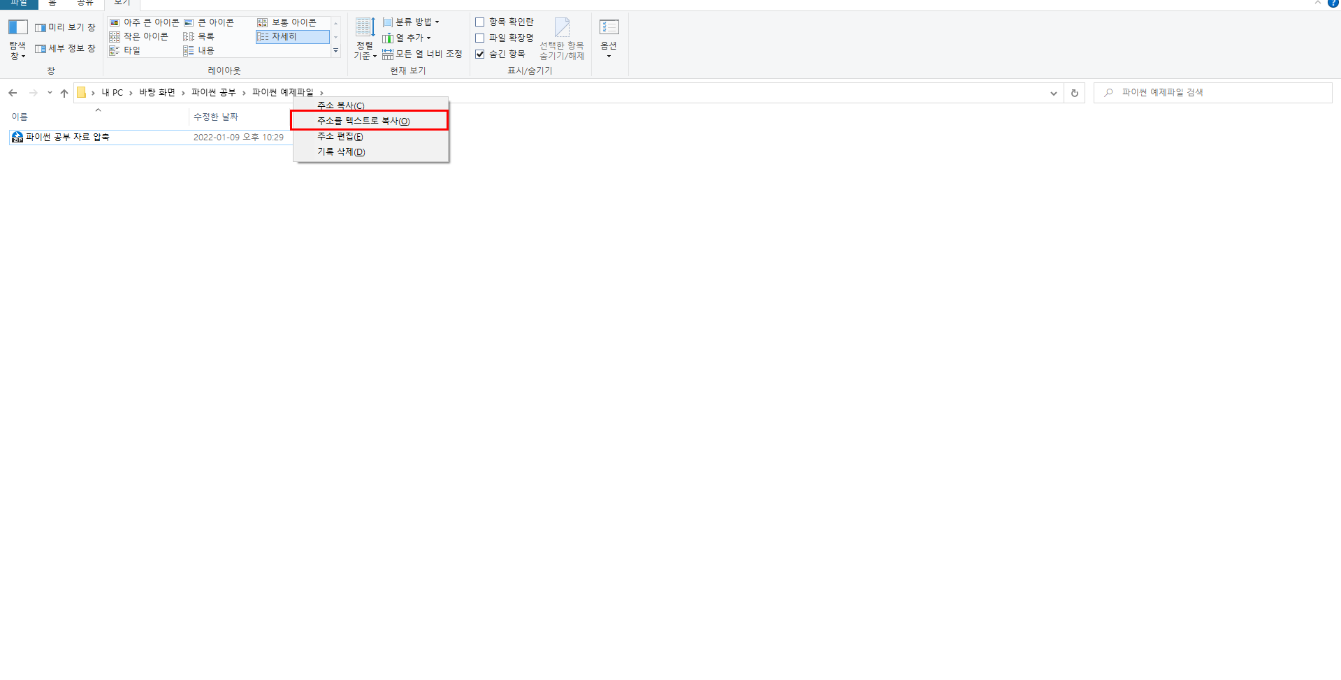 - 상단의 주소 창을 우클릭 하여, 내가 현재 열어둔 폴더의 주소를 텍스트로 복사합니다. 쉽죠?