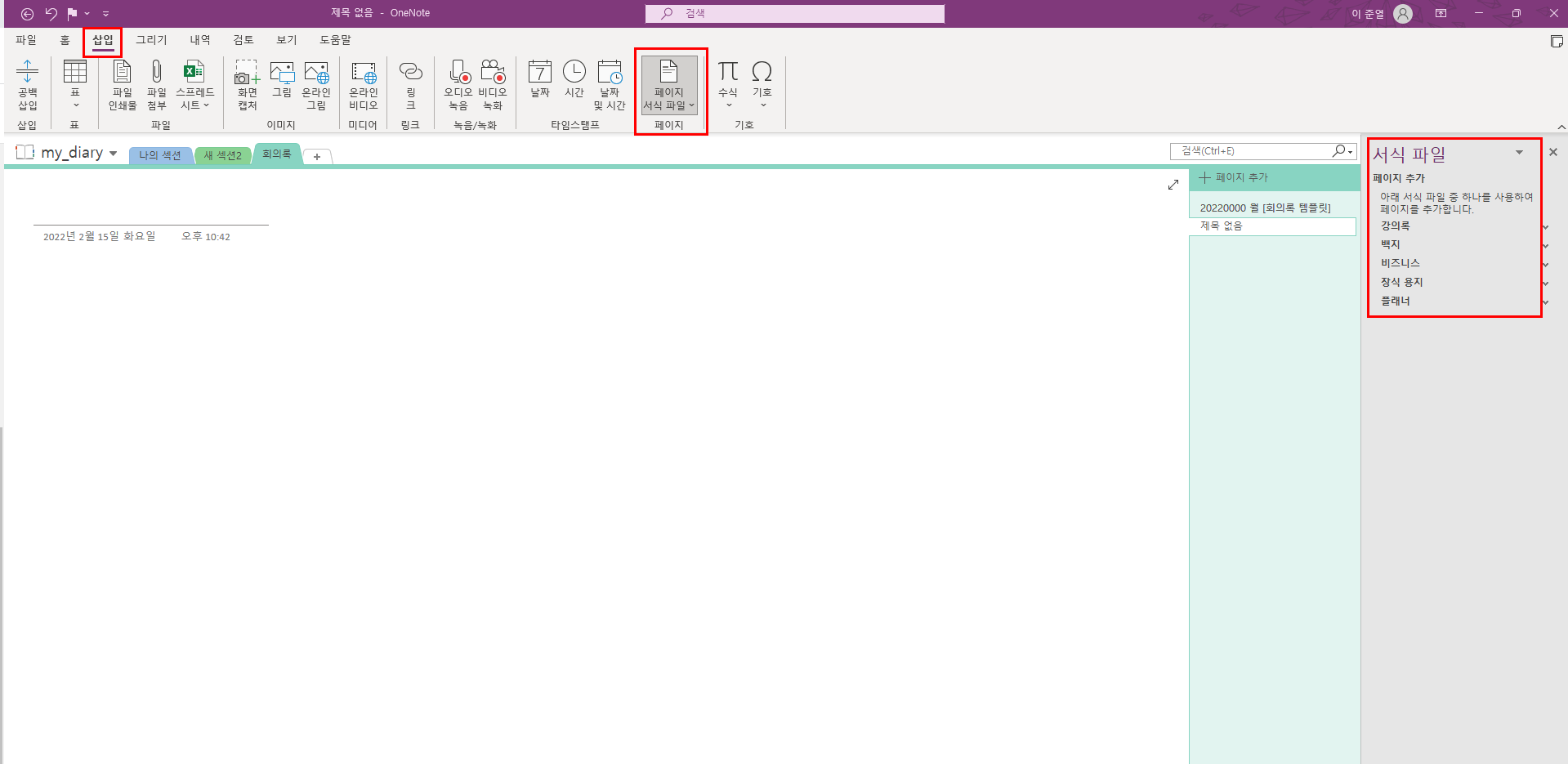 먼저 페이지 서식 파일의 위치는 "상단바" -> "삽입" -> "페이지 서식 파일" 버튼에서 확인할 수 있습니다.