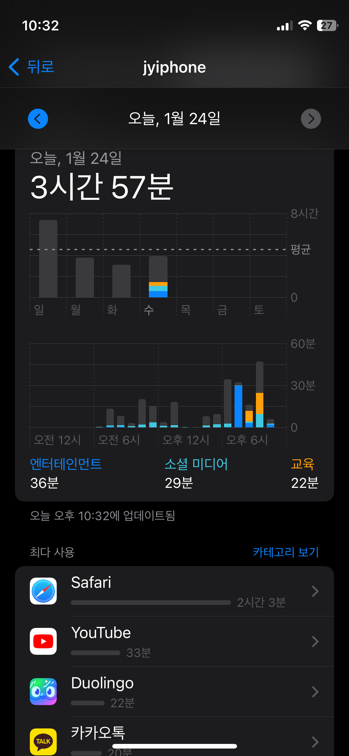 107일차인 오늘은 3시간 57분을 썼네요. 회사에서 저녁을 혼자 먹으면서 유튜브보고, 인터넷 봤더니 시간이 길어졌네요. 그래도 영어공부를 해서 그나마 낫습니다.