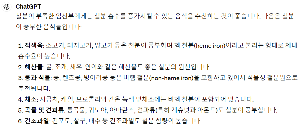 ChatGPT가 추천하는, 철분 부족한 임산부를 위한 음식은 다음과 같습니다.