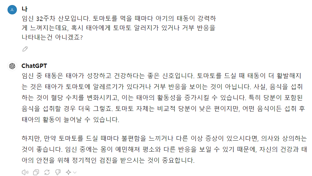일단 GPT 의견으로는 음식이 태아에게 알러지나 거부 반응을 보이는건 아니라고 합니다.