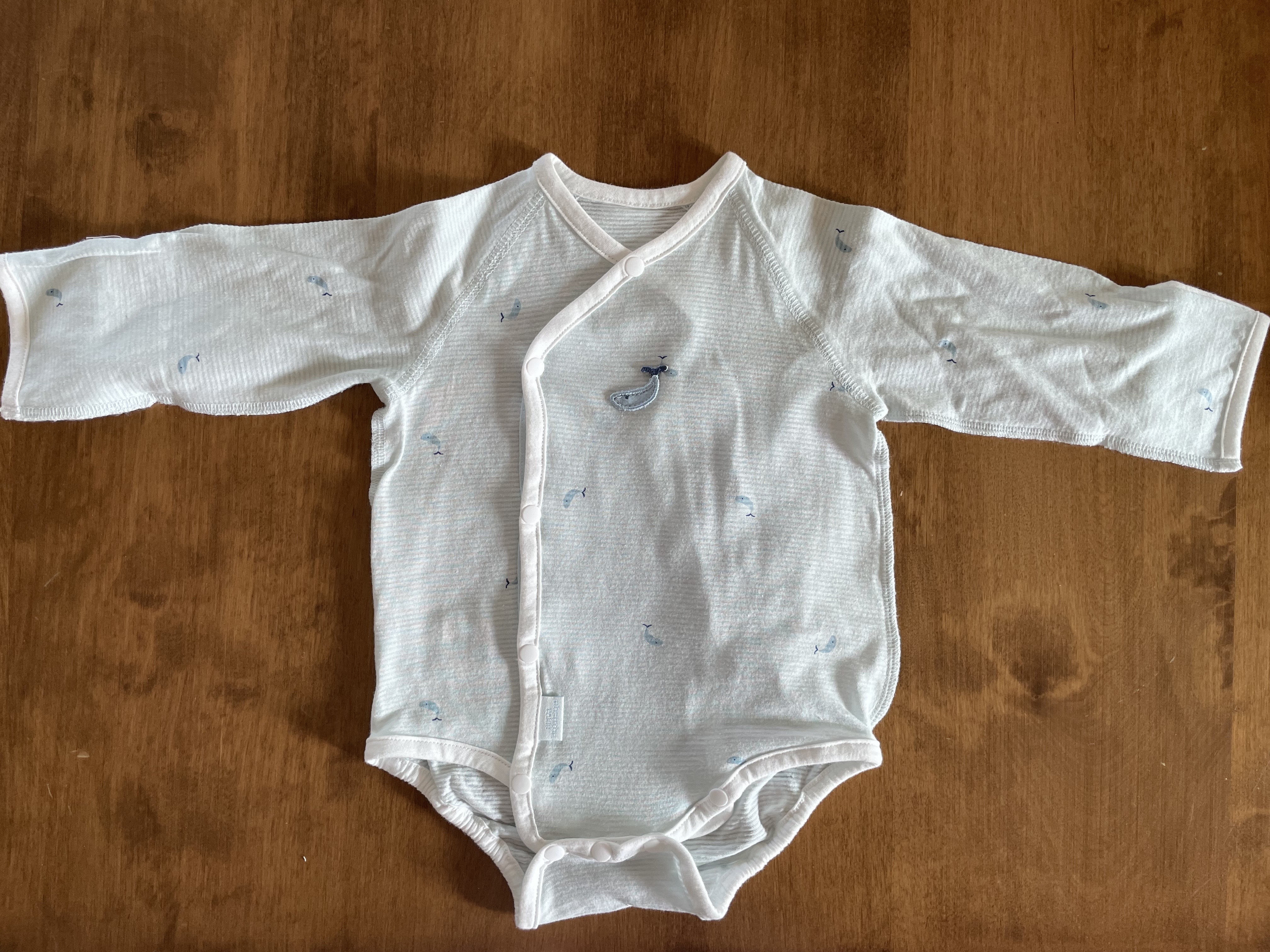 이건 고래 그림이 담긴 옷입니다. 저도 약간 하늘색, 민트색 옷을 좋아하는데 아기도 그런 옷을 입혀놓을 생각을 하니까 너무 신이 납니다. 특히 저도 고래를 좋아해서, 차 키도 고래모양 키링인데, 옷에도 귀여운 고래가 가득해서 좋아요.