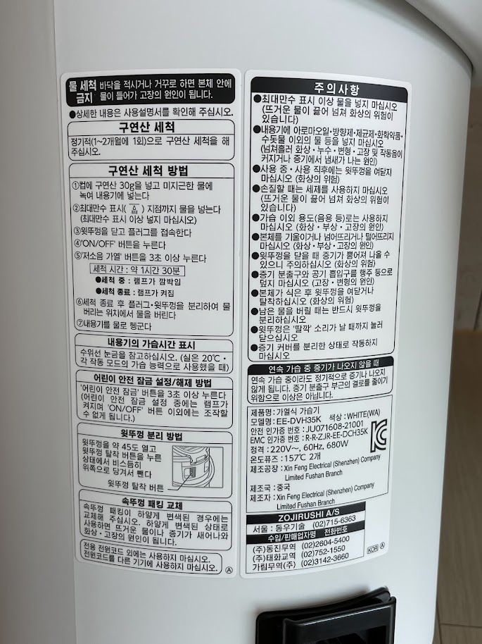 - 물을 버리고 받는 관리 방식과 구연산으로 세척하는 방법까지 모두 매우 수월하다.