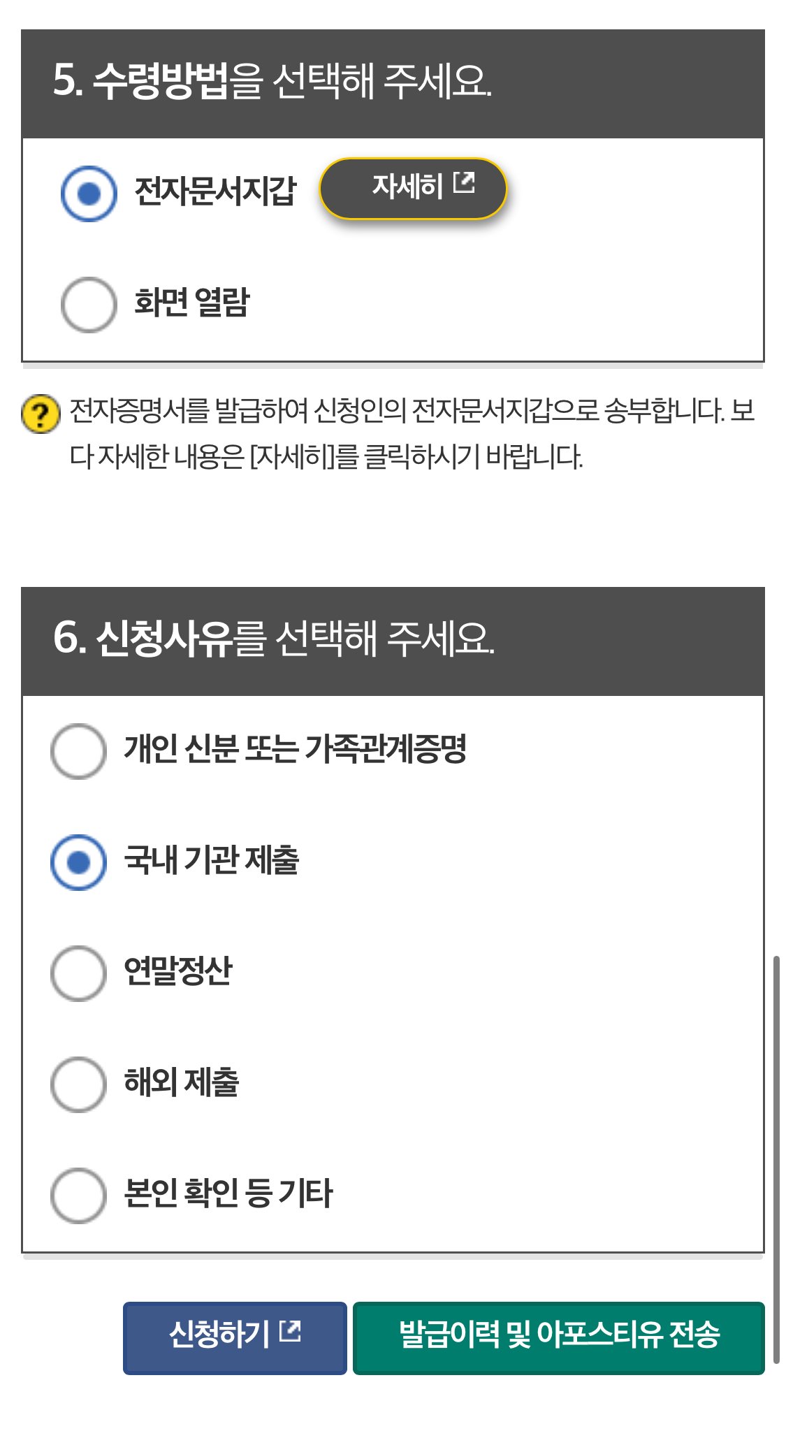 여기서 중요합니다. 앞서 언급한 바와 같이, 수령방법을 꼭 "전자문서지갑"으로 하셔서 신청을 완료하시기 바랍니다.
