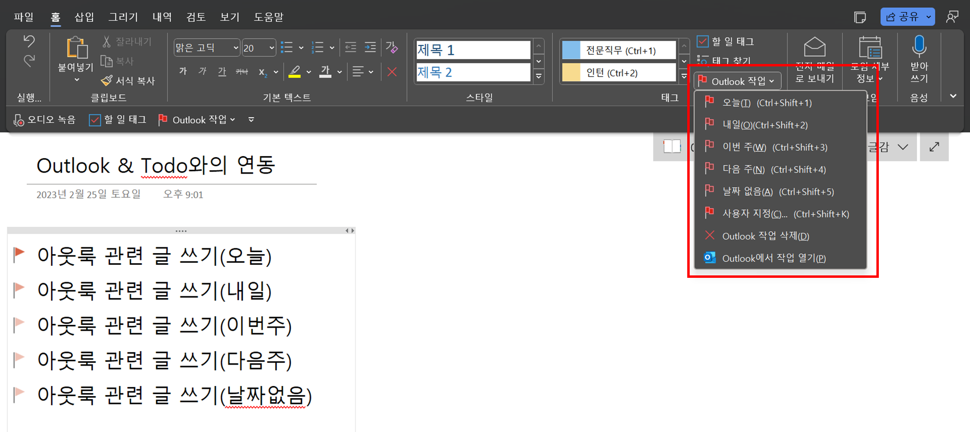 2. Onenote 홈 탭 - 우측의 Outlook 작업을 클릭하여 원하는 일정으로 체크합니다.