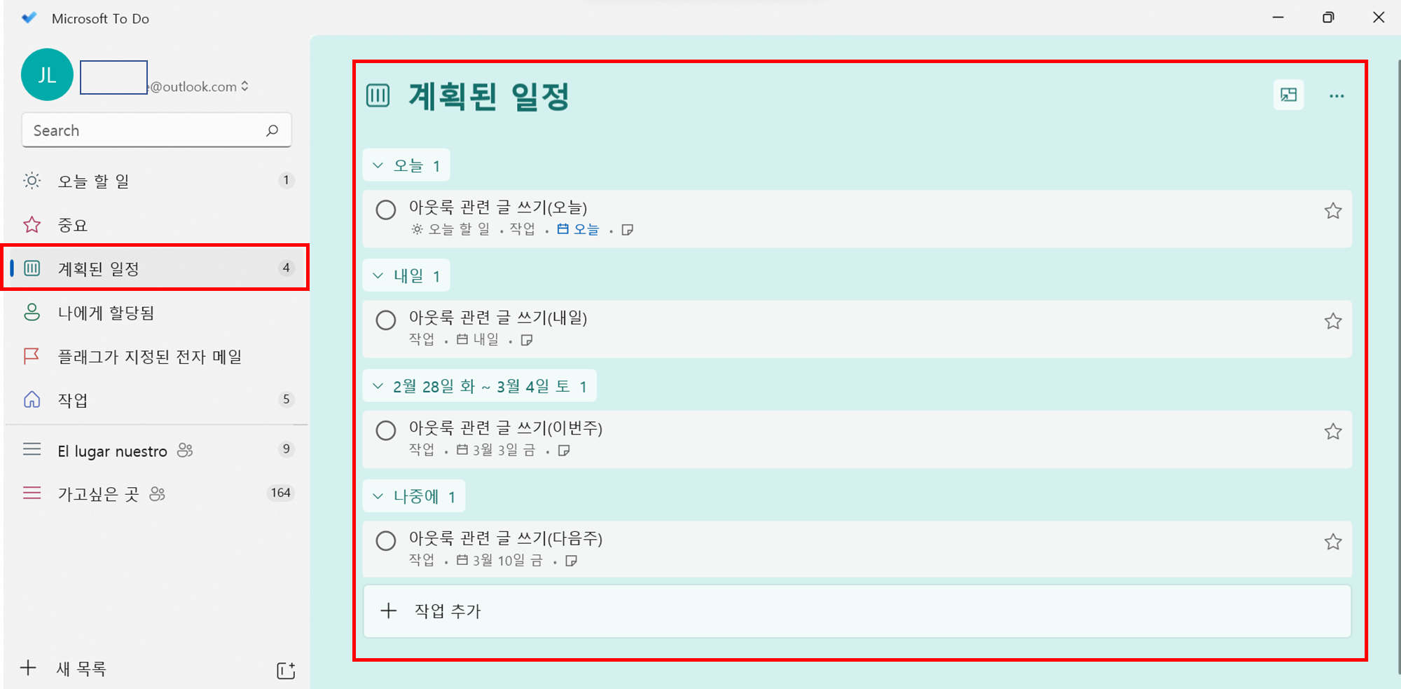 사실, 이 기능은 저는 잘 쓰지 않습니다. 여기 보다는 오늘의 핵심 기능인 MS TODO에서 확인하는 것이 더욱 중요합니다.