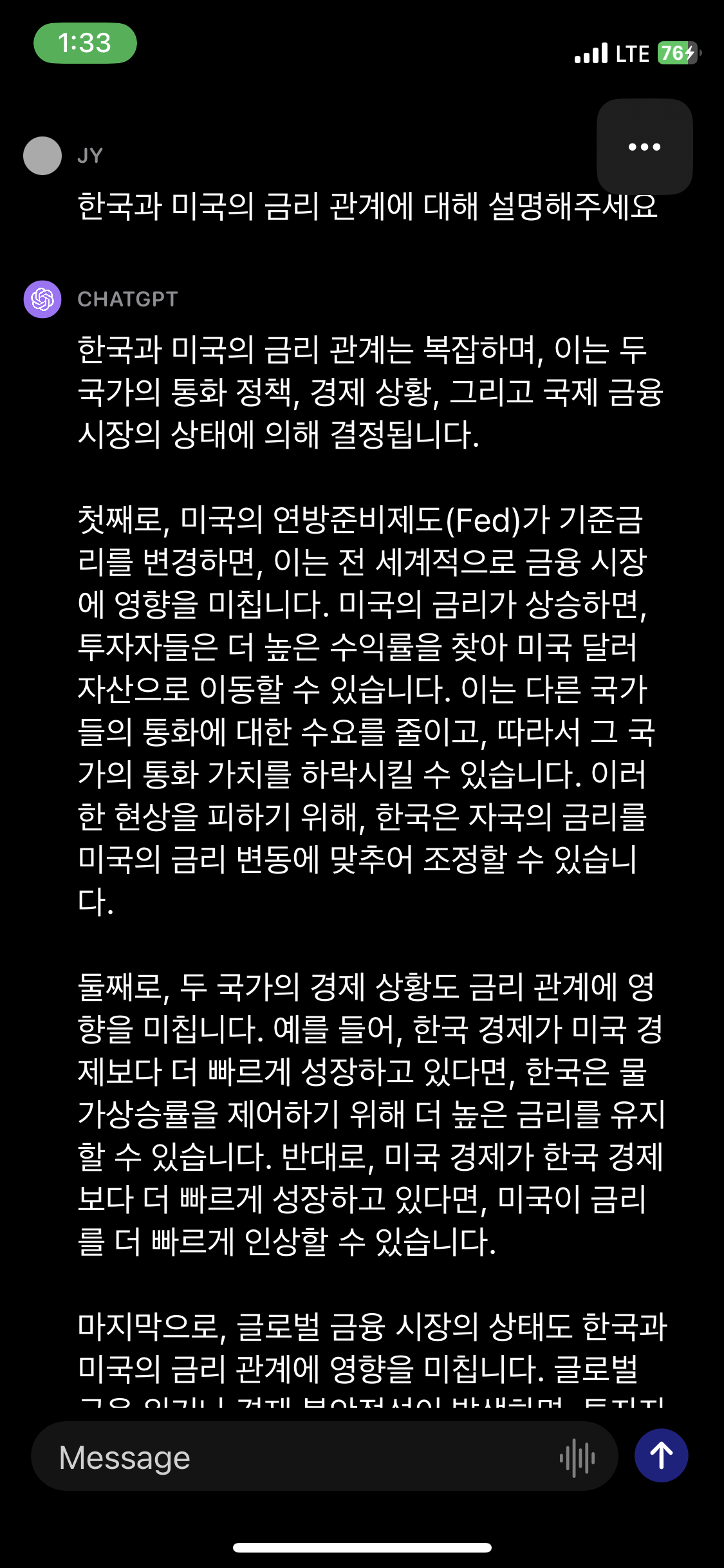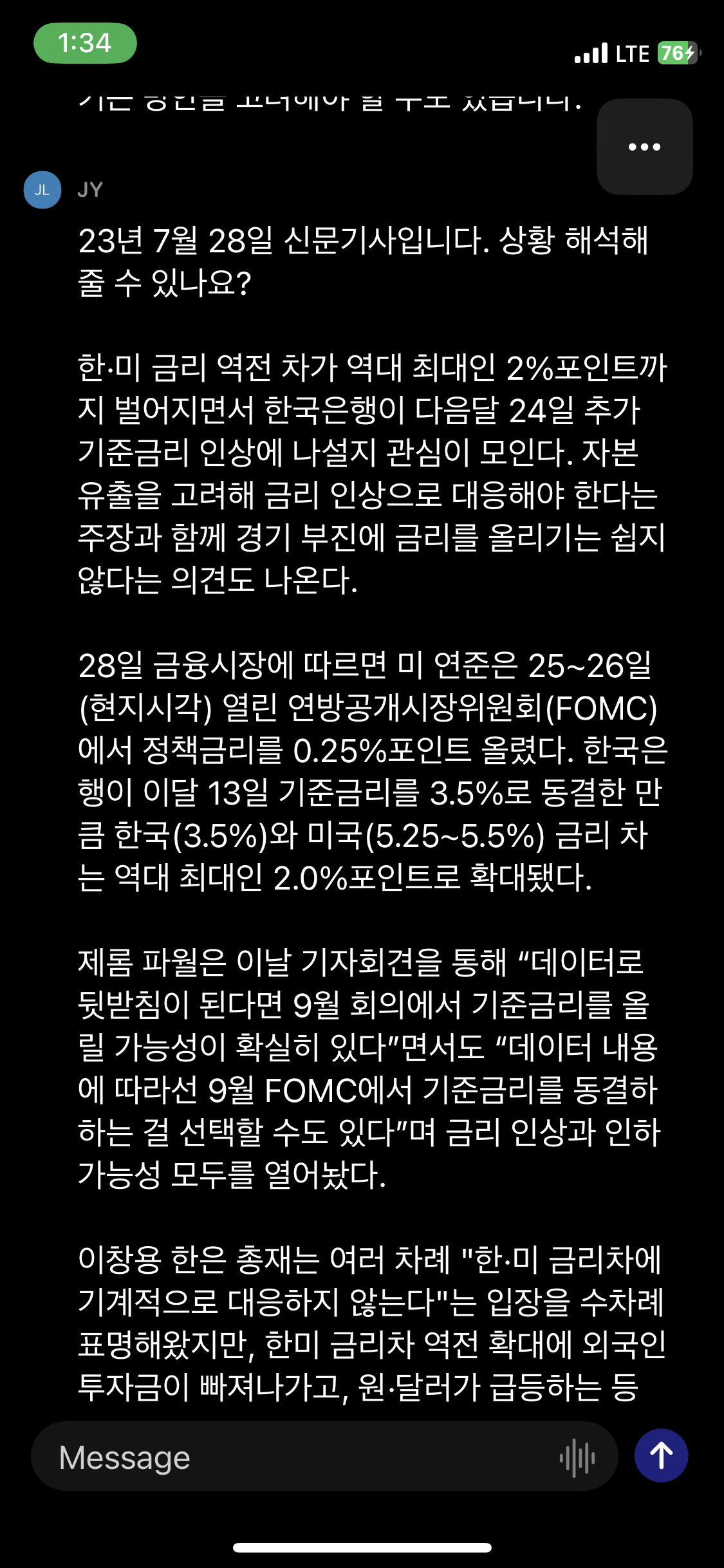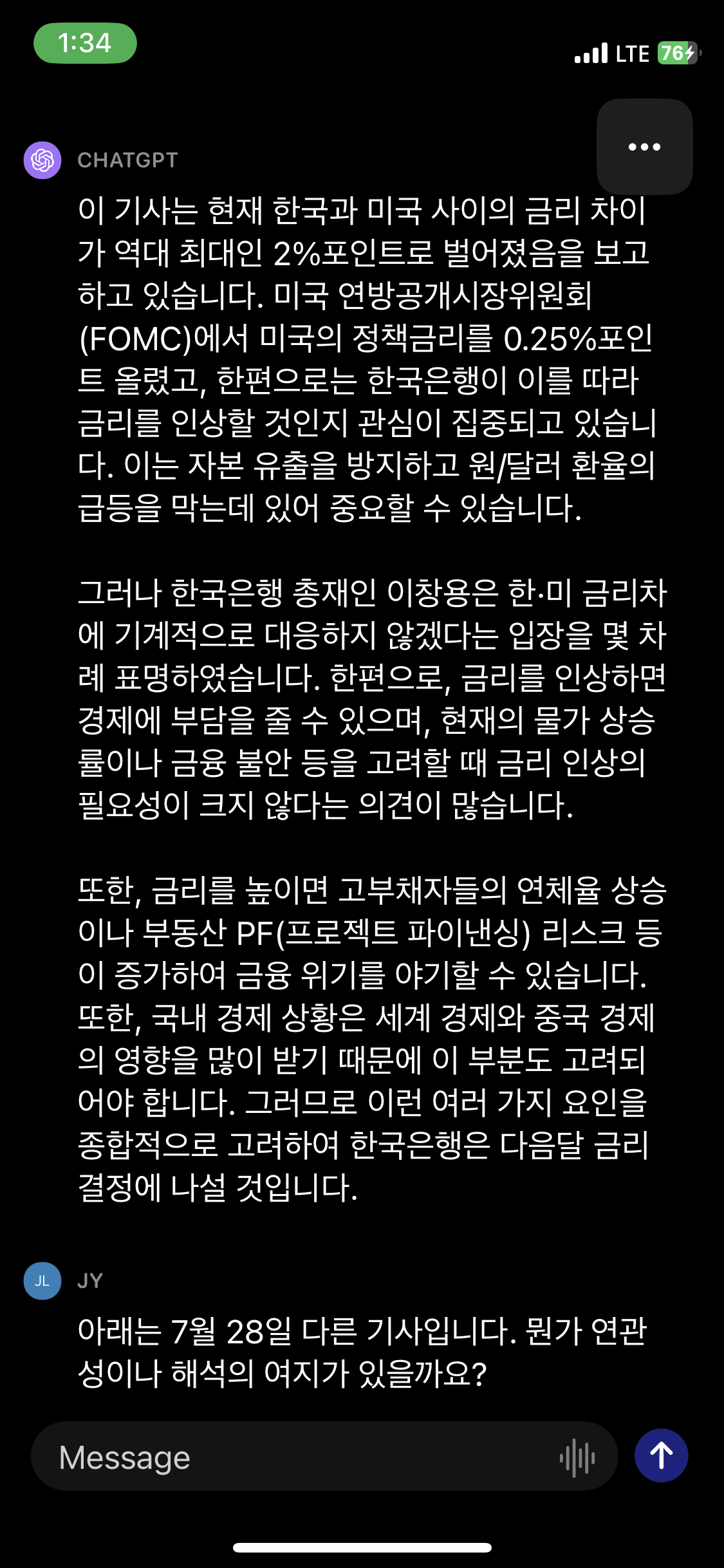 모바일로는 뉴스 링크를 GPT에 입력하고 분석 요청을 하는 것이 불가능하기 때문에 해당 신문 기사를 (무식하게) 복사/붙여넣기 하였습니다. 이런 것도 되는지 몰랐는데 되더라구요. 여기에 이어서, 다른 신문 기사의 내용도 같이 입력해서 각 기사 내용의 상관관계나 거시 경제를 해석해달라고 요청하기도 해보았습니다.