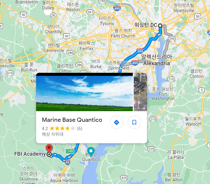 쓰다보니, FBI 아카데미와 CIA 본부, 미 해병대 콴티코 기지 등 버지니아 주에는 주요 시설들이 많이 위치해있는 것 같습니다. 아무래도 워싱턴 D.C와 가까워서 그런걸까요? 구글 지도로 찍어보는 재미가 있었습니다.
