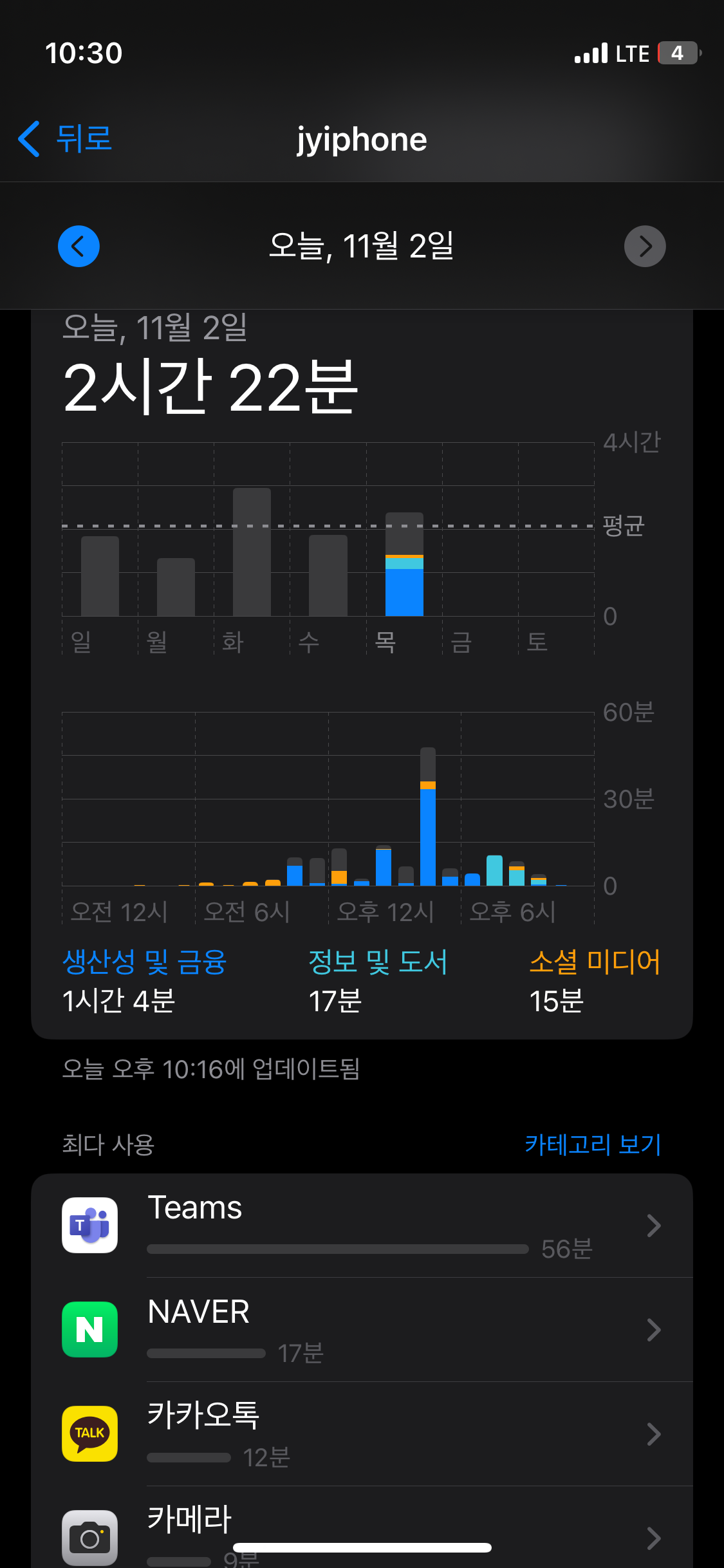전일 휴가였는데 업무용 메신저인 팀즈의 사용시간이 56분 입니다.
