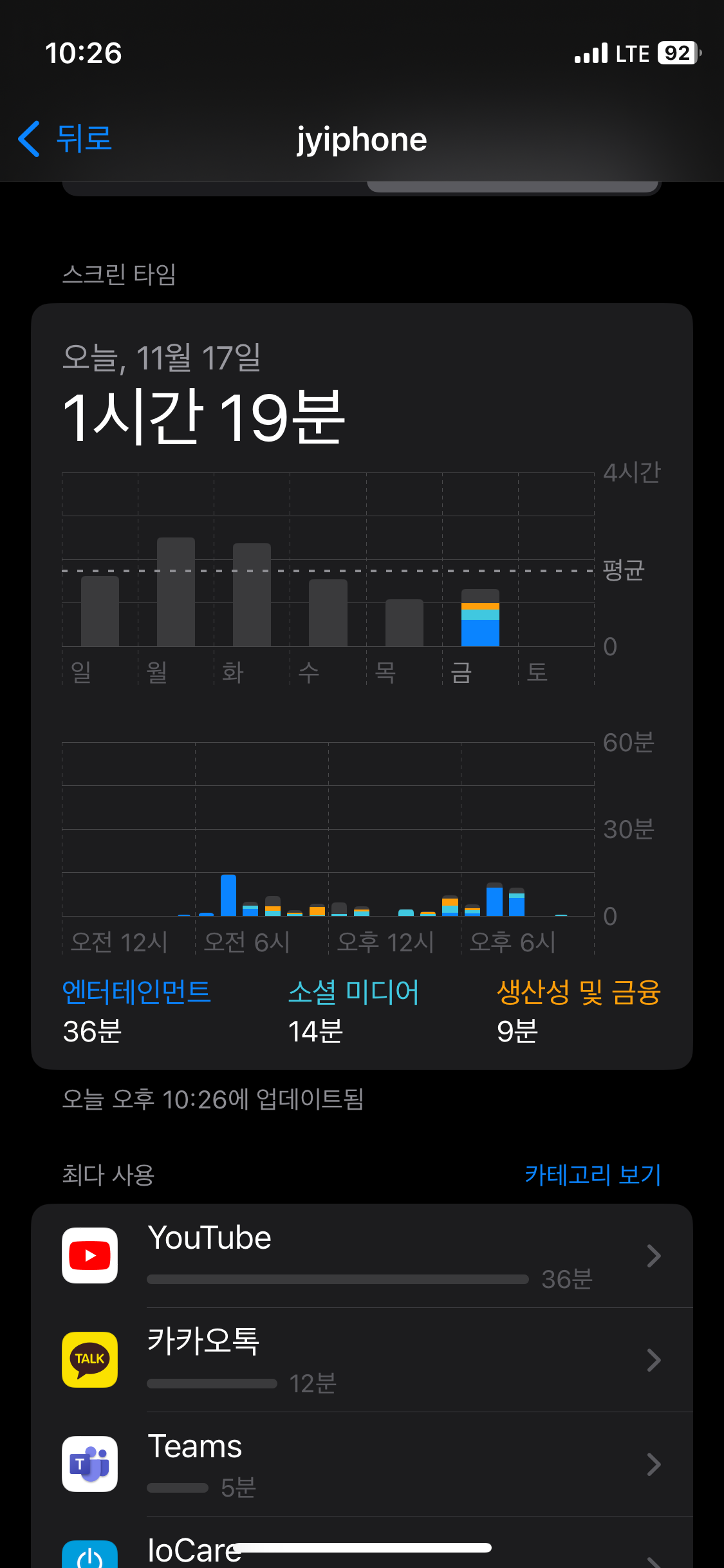 그 외에 카톡 팀즈 정도만 했으니까, 만족스러운 휴대폰 사용 시간인 것 같습니다.