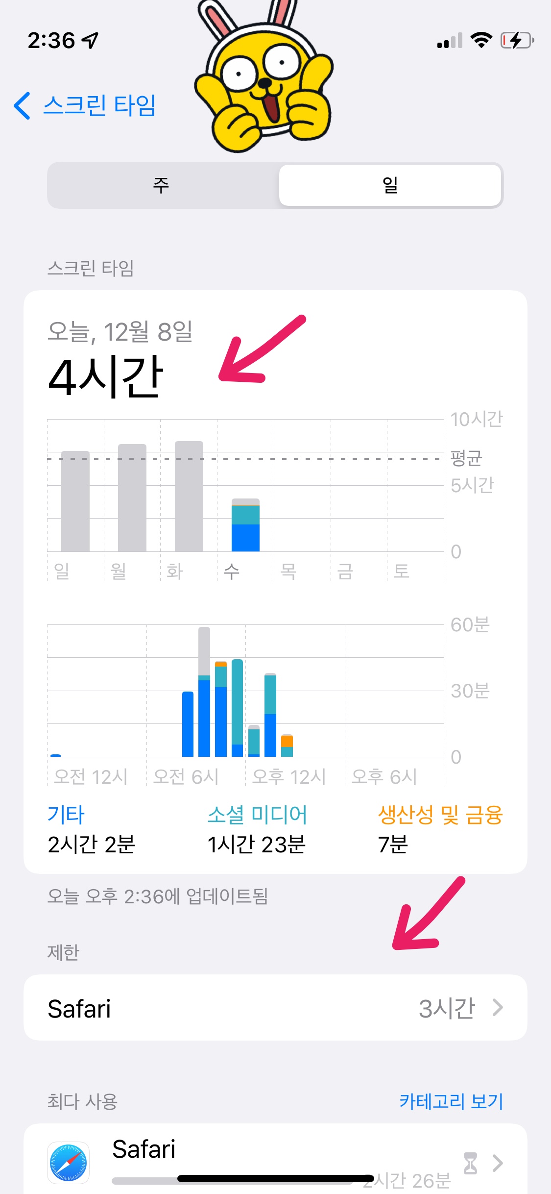 단순히 켜놓고 있는 카카오톡과는 달리, 사파리는 실제로 내가 휴대폰을 사용한 시간을 나타낸다.