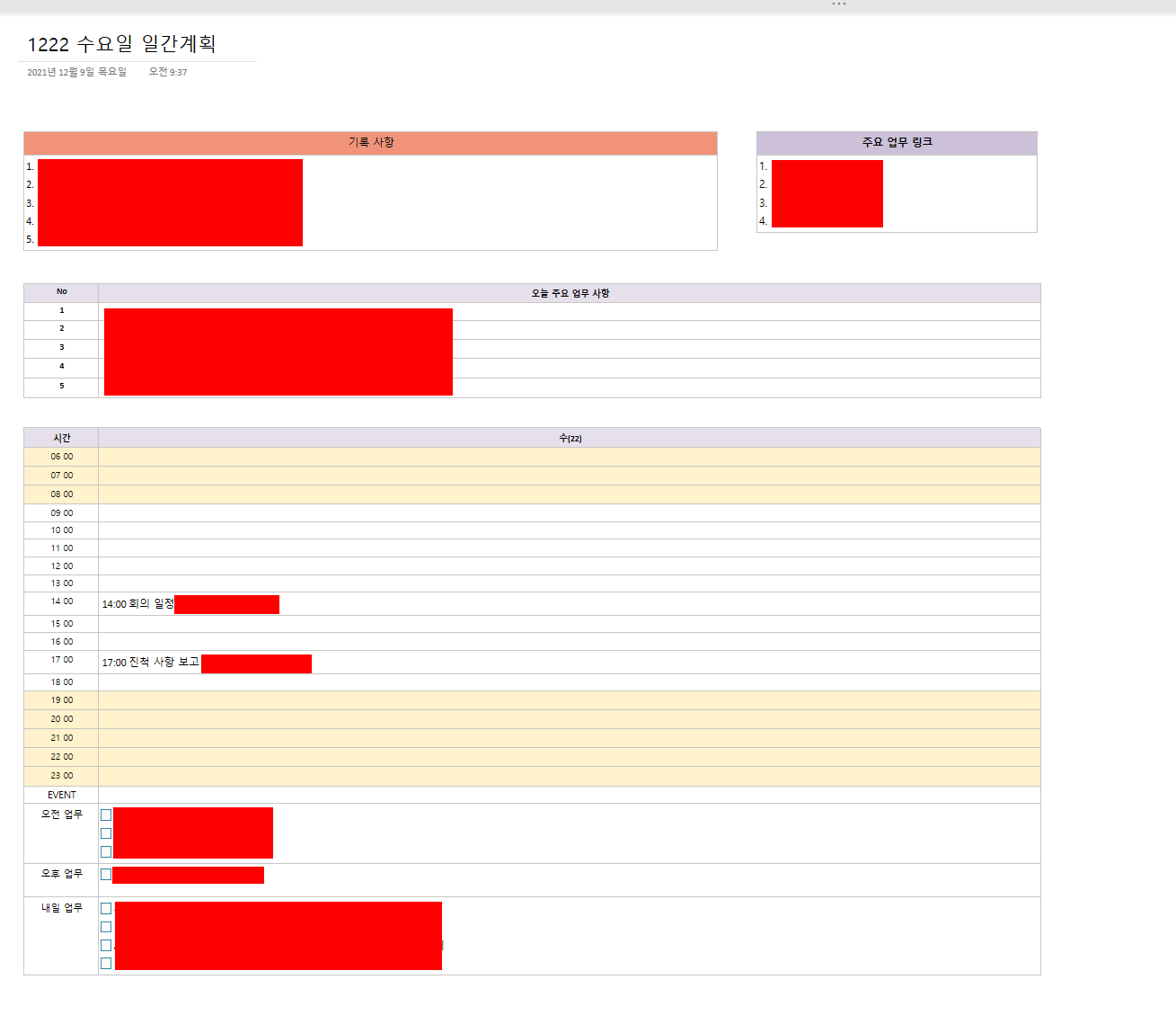 - 마찬가지로, 전날 계획표를 그대로 복붙해서 쓰기 때문에 기록사항, 주요 업무 링크 등이 유지됨